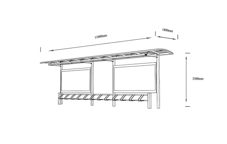 產品外觀 / PRODUCT DETAILS 產品信息 / PRODUCT INFO 【產品名稱】:公共自行車棚CP2-1 【產品系列】:公共自行車棚 【產品型號】:CP2-1 【產品規(guī)格】:長11000mm 寬1800mm 高3300mm 【產品材質】:熱鍍鋅鋼板 【使用年限】:10-15年 【詳情致電】:181-5189-0417、157-5170-8886 備注:產品可根據(jù)用戶需求選用材質、顏色及配件,個性化定制。 產品尺寸 / PRODUCT SIZE 關于輝盛 / 為社會分擔責任,為客戶創(chuàng)造價值 宿遷輝盛廣告設備有限公司是一家集設計、研發(fā)、生產為一體的城市公共設施生產型企業(yè)。主要產品有:候車公交亭、公交站臺、閱報欄、路名牌、垃圾箱、燈箱等市政設施系列產品和工程配套設施系列產品,現(xiàn)有高級技師30多人,高級職稱設計人員10人,是一家具有自主開發(fā)和設計能力的以公交亭、智能公交為主導的綜合性城市公共設施制造企業(yè)。為了進一步改善生產工藝,提高產品質量,公司引進了先進生產設備,包括立臥式加工中心,工業(yè)涂裝流水線,CNC車床,線切割機,大型數(shù)控板機,數(shù)控折邊機,數(shù)控沖孔機床,大型折彎機等。公司還專門成立了產品研發(fā)部門,現(xiàn)每年自主開發(fā)或應客戶要求設計推出多款新產品。 榮譽資質 / ENTERPRISE HONOR