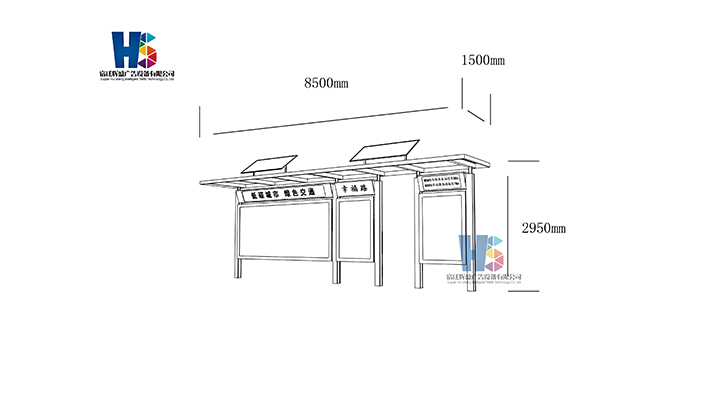 產(chǎn)品外觀 / PRODUCT DETAILS 產(chǎn)品信息 / PRODUCT INFO 【產(chǎn)品名稱】:新款候車亭HS2 【產(chǎn)品系列】:新款候車亭 【產(chǎn)品型號(hào)】:HS2 【產(chǎn)品規(guī)格】:長(zhǎng)8500mm 寬1500mm 高2950mm 【產(chǎn)品材質(zhì)】:熱鍍鋅鋼板 【使用年限】:10-15年 【詳情致電】:181-5189-0417、157-5170-8886 備注:產(chǎn)品可根據(jù)用戶需求選用材質(zhì)、顏色及配件,個(gè)性化定制。 1、表面采用靜電噴塑(氟碳烤漆/搪瓷處理) 2、頂棚采用100*100*1.5mm、100*150*2mm鍍鋅管,3mm鍍鋅板激光切割件、1.5mm鍍鋅板焊接骨架,鋪1mm鍍鋅板(10mm陽光板) 3、立柱采用150*150*3mm鍍鋅管 4、箱體采用1.5mm鍍鋅板折彎焊接成型,門框采用全玻鋁合金型材,視窗采用6mm鋼化玻璃 5、照明電器采用LED燈粒 產(chǎn)品尺寸 / PRODUCT SIZE 關(guān)于輝盛 / 為社會(huì)分擔(dān)責(zé)任,為客戶創(chuàng)造價(jià)值 宿遷輝盛廣告設(shè)備有限公司是一家集設(shè)計(jì)、研發(fā)、生產(chǎn)為一體的城市公共設(shè)施生產(chǎn)型企業(yè)。主要產(chǎn)品有:候車公交亭、公交站臺(tái)、閱報(bào)欄、路名牌、垃圾箱、燈箱等市政設(shè)施系列產(chǎn)品和工程配套設(shè)施系列產(chǎn)品,現(xiàn)有高級(jí)技師30多人,高級(jí)職稱設(shè)計(jì)人員10人,是一家具有自主開發(fā)和設(shè)計(jì)能力的以公交亭、智能公交為主導(dǎo)的綜合性城市公共設(shè)施制造企業(yè)。為了進(jìn)一步改善生產(chǎn)工藝,提高產(chǎn)品質(zhì)量,公司引進(jìn)了先進(jìn)生產(chǎn)設(shè)備,包括立臥式加工中心,工業(yè)涂裝流水線,CNC車床,線切割機(jī),大型數(shù)控板機(jī),數(shù)控折邊機(jī),數(shù)控沖孔機(jī)床,大型折彎?rùn)C(jī)等。公司還專門成立了產(chǎn)品研發(fā)部門,現(xiàn)每年自主開發(fā)或應(yīng)客戶要求設(shè)計(jì)推出多款新產(chǎn)品。 榮譽(yù)資質(zhì) / ENTERPRISE HONOR