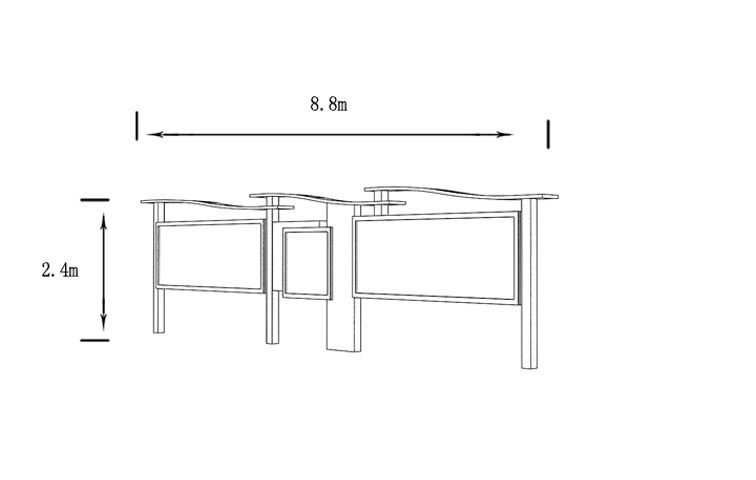 產(chǎn)品外觀 / PRODUCT DETAILS 產(chǎn)品信息 / PRODUCT INFO 【產(chǎn)品名稱】:宣傳欄XCL11-1 【產(chǎn)品系列】:宣傳欄 【產(chǎn)品型號】:XCL11-1 【產(chǎn)品規(guī)格】:長8800mm高2400mm 【產(chǎn)品材質(zhì)】:熱鍍鋅鋼板 【使用年限】:10-15年 【詳情致電】:181-5189-0417、157-5170-8886 備注:產(chǎn)品可根據(jù)用戶需求選用材質(zhì)、顏色及配件,個性化定制。 1、表面采用靜電噴塑(氟碳烤漆/搪瓷處理) 2、頂棚采用100*100*1.5mm、100*150*2mm鍍鋅管,3mm鍍鋅板激光切割件、1.5mm鍍鋅板焊接骨架,鋪1mm鍍鋅板(10mm陽光板) 3、立柱采用150*150*3mm鍍鋅管 4、箱體采用1.5mm鍍鋅板折彎焊接成型,門框采用全玻鋁合金型材,視窗采用6mm鋼化玻璃 5、照明電器采用LED燈粒 產(chǎn)品尺寸 / PRODUCT SIZE 關(guān)于輝盛 / 為社會分擔(dān)責(zé)任,為客戶創(chuàng)造價值 宿遷輝盛廣告設(shè)備有限公司是一家集設(shè)計、研發(fā)、生產(chǎn)為一體的城市公共設(shè)施生產(chǎn)型企業(yè)。主要產(chǎn)品有:候車公交亭、公交站臺、閱報欄、路名牌、垃圾箱、燈箱等市政設(shè)施系列產(chǎn)品和工程配套設(shè)施系列產(chǎn)品,現(xiàn)有高級技師30多人,高級職稱設(shè)計人員10人,是一家具有自主開發(fā)和設(shè)計能力的以公交亭、智能公交為主導(dǎo)的綜合性城市公共設(shè)施制造企業(yè)。為了進一步改善生產(chǎn)工藝,提高產(chǎn)品質(zhì)量,公司引進了先進生產(chǎn)設(shè)備,包括立臥式加工中心,工業(yè)涂裝流水線,CNC車床,線切割機,大型數(shù)控板機,數(shù)控折邊機,數(shù)控沖孔機床,大型折彎機等。公司還專門成立了產(chǎn)品研發(fā)部門,現(xiàn)每年自主開發(fā)或應(yīng)客戶要求設(shè)計推出多款新產(chǎn)品。 榮譽資質(zhì) / ENTERPRISE HONOR