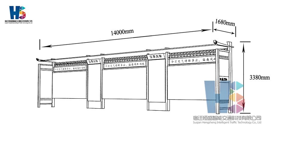 產(chǎn)品外觀 / PRODUCT DETAILS 產(chǎn)品信息 / PRODUCT INFO 【產(chǎn)品名稱(chēng)】:中式古典候車(chē)亭GD14 【產(chǎn)品系列】:中式古典候車(chē)亭 【產(chǎn)品型號(hào)】:GD14 【產(chǎn)品規(guī)格】:長(zhǎng)10800mm 寬1700mm 高2900mm 【產(chǎn)品材質(zhì)】:熱鍍鋅鋼板 【使用年限】:10-15年 【詳情致電】:181-5189-0417、157-5170-8886 備注:產(chǎn)品可根據(jù)用戶(hù)需求選用材質(zhì)、顏色及配件,個(gè)性化定制。 1、表面采用靜電噴塑(氟碳烤漆/搪瓷處理) 2、頂棚采用100*100*1.5mm、100*150*2mm鍍鋅管,3mm鍍鋅板激光切割件、1.5mm鍍鋅板焊接骨架,鋪1mm鍍鋅板(10mm陽(yáng)光板) 3、立柱采用150*150*3mm鍍鋅管 4、箱體采用1.5mm鍍鋅板折彎焊接成型,門(mén)框采用全玻鋁合金型材,視窗采用6mm鋼化玻璃 5、照明電器采用LED燈粒 產(chǎn)品尺寸 / PRODUCT SIZE 關(guān)于輝盛 / 為社會(huì)分擔(dān)責(zé)任,為客戶(hù)創(chuàng)造價(jià)值 宿遷輝盛廣告設(shè)備有限公司是一家集設(shè)計(jì)、研發(fā)、生產(chǎn)為一體的城市公共設(shè)施生產(chǎn)型企業(yè)。主要產(chǎn)品有:候車(chē)公交亭、公交站臺(tái)、閱報(bào)欄、路名牌、垃圾箱、燈箱等市政設(shè)施系列產(chǎn)品和工程配套設(shè)施系列產(chǎn)品,現(xiàn)有高級(jí)技師30多人,高級(jí)職稱(chēng)設(shè)計(jì)人員10人,是一家具有自主開(kāi)發(fā)和設(shè)計(jì)能力的以公交亭、智能公交為主導(dǎo)的綜合性城市公共設(shè)施制造企業(yè)。為了進(jìn)一步改善生產(chǎn)工藝,提高產(chǎn)品質(zhì)量,公司引進(jìn)了先進(jìn)生產(chǎn)設(shè)備,包括立臥式加工中心,工業(yè)涂裝流水線,CNC車(chē)床,線切割機(jī),大型數(shù)控板機(jī),數(shù)控折邊機(jī),數(shù)控沖孔機(jī)床,大型折彎?rùn)C(jī)等。公司還專(zhuān)門(mén)成立了產(chǎn)品研發(fā)部門(mén),現(xiàn)每年自主開(kāi)發(fā)或應(yīng)客戶(hù)要求設(shè)計(jì)推出多款新產(chǎn)品。 榮譽(yù)資質(zhì) / ENTERPRISE HONOR