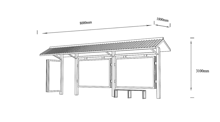 產(chǎn)品外觀 / PRODUCT DETAILS 產(chǎn)品信息 / PRODUCT INFO 【產(chǎn)品名稱】:中式古典候車亭GD2 【產(chǎn)品系列】:中式古典候車亭 【產(chǎn)品型號(hào)】:GD2 【產(chǎn)品規(guī)格】:長10800mm 寬1700mm 高2900mm 【產(chǎn)品材質(zhì)】:熱鍍鋅鋼板 【使用年限】:10-15年 【詳情致電】:181-5189-0417、157-5170-8886 備注:產(chǎn)品可根據(jù)用戶需求選用材質(zhì)、顏色及配件,個(gè)性化定制。 1、表面采用靜電噴塑(氟碳烤漆/搪瓷處理) 2、頂棚采用100*100*1.5mm、100*150*2mm鍍鋅管,3mm鍍鋅板激光切割件、1.5mm鍍鋅板焊接骨架,鋪1mm鍍鋅板(10mm陽光板) 3、立柱采用150*150*3mm鍍鋅管 4、箱體采用1.5mm鍍鋅板折彎焊接成型,門框采用全玻鋁合金型材,視窗采用6mm鋼化玻璃 5、照明電器采用LED燈粒 產(chǎn)品尺寸 / PRODUCT SIZE 關(guān)于輝盛 / 為社會(huì)分擔(dān)責(zé)任,為客戶創(chuàng)造價(jià)值 宿遷輝盛廣告設(shè)備有限公司是一家集設(shè)計(jì)、研發(fā)、生產(chǎn)為一體的城市公共設(shè)施生產(chǎn)型企業(yè)。主要產(chǎn)品有:候車公交亭、公交站臺(tái)、閱報(bào)欄、路名牌、垃圾箱、燈箱等市政設(shè)施系列產(chǎn)品和工程配套設(shè)施系列產(chǎn)品,現(xiàn)有高級(jí)技師30多人,高級(jí)職稱設(shè)計(jì)人員10人,是一家具有自主開發(fā)和設(shè)計(jì)能力的以公交亭、智能公交為主導(dǎo)的綜合性城市公共設(shè)施制造企業(yè)。為了進(jìn)一步改善生產(chǎn)工藝,提高產(chǎn)品質(zhì)量,公司引進(jìn)了先進(jìn)生產(chǎn)設(shè)備,包括立臥式加工中心,工業(yè)涂裝流水線,CNC車床,線切割機(jī),大型數(shù)控板機(jī),數(shù)控折邊機(jī),數(shù)控沖孔機(jī)床,大型折彎機(jī)等。公司還專門成立了產(chǎn)品研發(fā)部門,現(xiàn)每年自主開發(fā)或應(yīng)客戶要求設(shè)計(jì)推出多款新產(chǎn)品。 榮譽(yù)資質(zhì) / ENTERPRISE HONOR