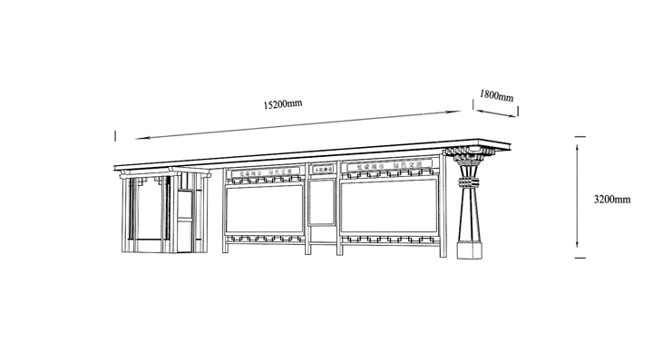 產(chǎn)品外觀 / PRODUCT DETAILS 產(chǎn)品信息 / PRODUCT INFO 【產(chǎn)品名稱】:中式古典候車亭GD1 【產(chǎn)品系列】:中式古典候車亭 【產(chǎn)品型號(hào)】:GD1 【產(chǎn)品規(guī)格】:長10800mm 寬1700mm 高2900mm 【產(chǎn)品材質(zhì)】:熱鍍鋅鋼板 【使用年限】:10-15年 【詳情致電】:181-5189-0417、157-5170-8886 備注:產(chǎn)品可根據(jù)用戶需求選用材質(zhì)、顏色及配件,個(gè)性化定制。 1、表面采用靜電噴塑(氟碳烤漆/搪瓷處理) 2、頂棚采用100*100*1.5mm、100*150*2mm鍍鋅管,3mm鍍鋅板激光切割件、1.5mm鍍鋅板焊接骨架,鋪1mm鍍鋅板(10mm陽光板) 3、立柱采用150*150*3mm鍍鋅管 4、箱體采用1.5mm鍍鋅板折彎焊接成型,門框采用全玻鋁合金型材,視窗采用6mm鋼化玻璃 5、照明電器采用LED燈粒 產(chǎn)品尺寸 / PRODUCT SIZE 關(guān)于輝盛 / 為社會(huì)分擔(dān)責(zé)任,為客戶創(chuàng)造價(jià)值 宿遷輝盛廣告設(shè)備有限公司是一家集設(shè)計(jì)、研發(fā)、生產(chǎn)為一體的城市公共設(shè)施生產(chǎn)型企業(yè)。主要產(chǎn)品有:候車公交亭、公交站臺(tái)、閱報(bào)欄、路名牌、垃圾箱、燈箱等市政設(shè)施系列產(chǎn)品和工程配套設(shè)施系列產(chǎn)品,現(xiàn)有高級(jí)技師30多人,高級(jí)職稱設(shè)計(jì)人員10人,是一家具有自主開發(fā)和設(shè)計(jì)能力的以公交亭、智能公交為主導(dǎo)的綜合性城市公共設(shè)施制造企業(yè)。為了進(jìn)一步改善生產(chǎn)工藝,提高產(chǎn)品質(zhì)量,公司引進(jìn)了先進(jìn)生產(chǎn)設(shè)備,包括立臥式加工中心,工業(yè)涂裝流水線,CNC車床,線切割機(jī),大型數(shù)控板機(jī),數(shù)控折邊機(jī),數(shù)控沖孔機(jī)床,大型折彎機(jī)等。公司還專門成立了產(chǎn)品研發(fā)部門,現(xiàn)每年自主開發(fā)或應(yīng)客戶要求設(shè)計(jì)推出多款新產(chǎn)品。 榮譽(yù)資質(zhì) / ENTERPRISE HONOR